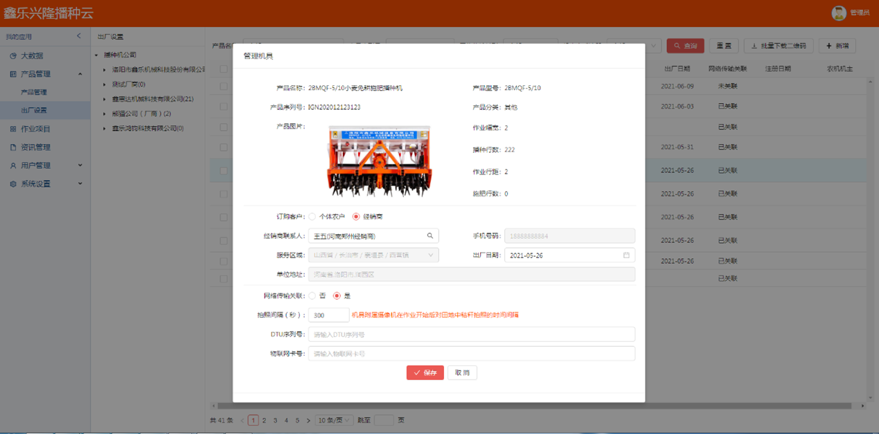 - 大數(shù)據(jù)中心:為播種機(農(nóng)機)生產(chǎn)廠家、播種機(農(nóng)機)經(jīng)銷商、其他農(nóng)資(機)經(jīng)銷商提供農(nóng)機作業(yè)相關(guān)的數(shù)據(jù)統(tǒng)計及展示功能。