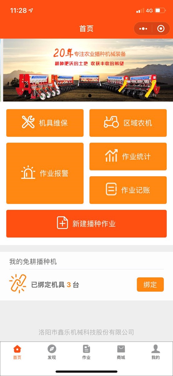 - 首頁:為登錄用戶提供創(chuàng)建作業(yè)、機具維保、區(qū)域農(nóng)機、作業(yè)報警、作業(yè)統(tǒng)計及作業(yè)記賬等重點功能的快捷入口。