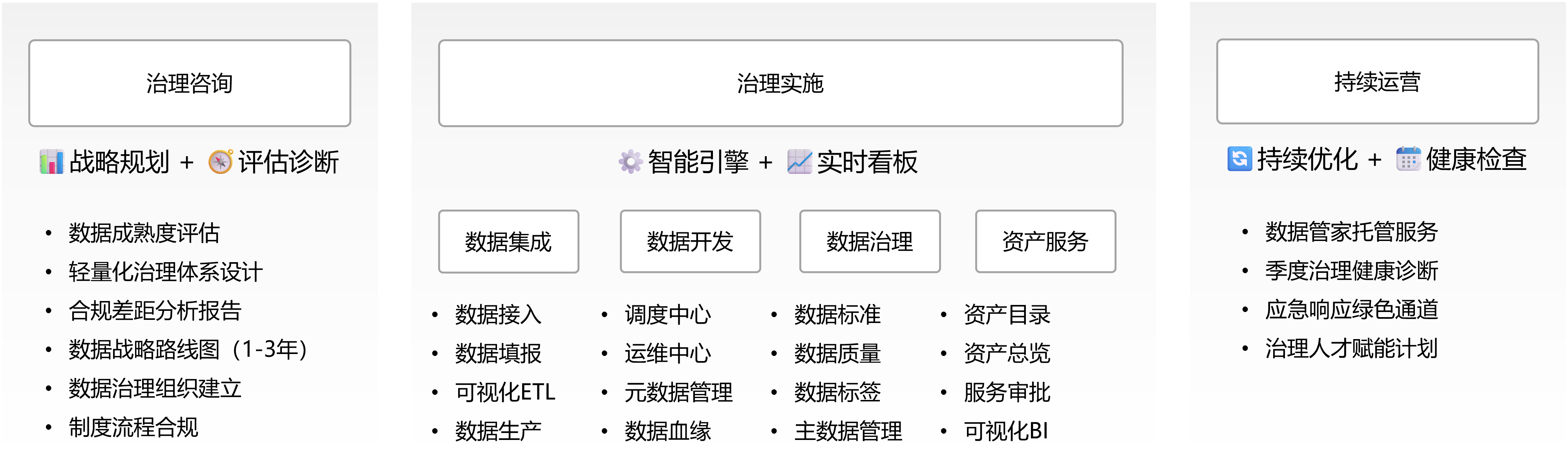數(shù)據(jù)治理服務(wù)流程圖“樞理”從戰(zhàn)略高度出發(fā),開展數(shù)據(jù)治理咨詢。通過數(shù)據(jù)成熟度評估,精準診斷企業(yè)數(shù)據(jù)管理現(xiàn)狀;設(shè)計輕量化治理體系,適配企業(yè)規(guī)模與業(yè)務(wù)特性;出具合規(guī)差距分析報告,保障數(shù)據(jù)管理符合行業(yè)規(guī)范。同時,繪制1 - 3年數(shù)據(jù)戰(zhàn)略路線圖,明確長期治理方向;協(xié)助建立數(shù)據(jù)治理組織,厘清職責(zé)分工;規(guī)范制度流程,讓數(shù)據(jù)治理“有章可循”,為后續(xù)治理筑牢頂層設(shè)計基礎(chǔ) 。