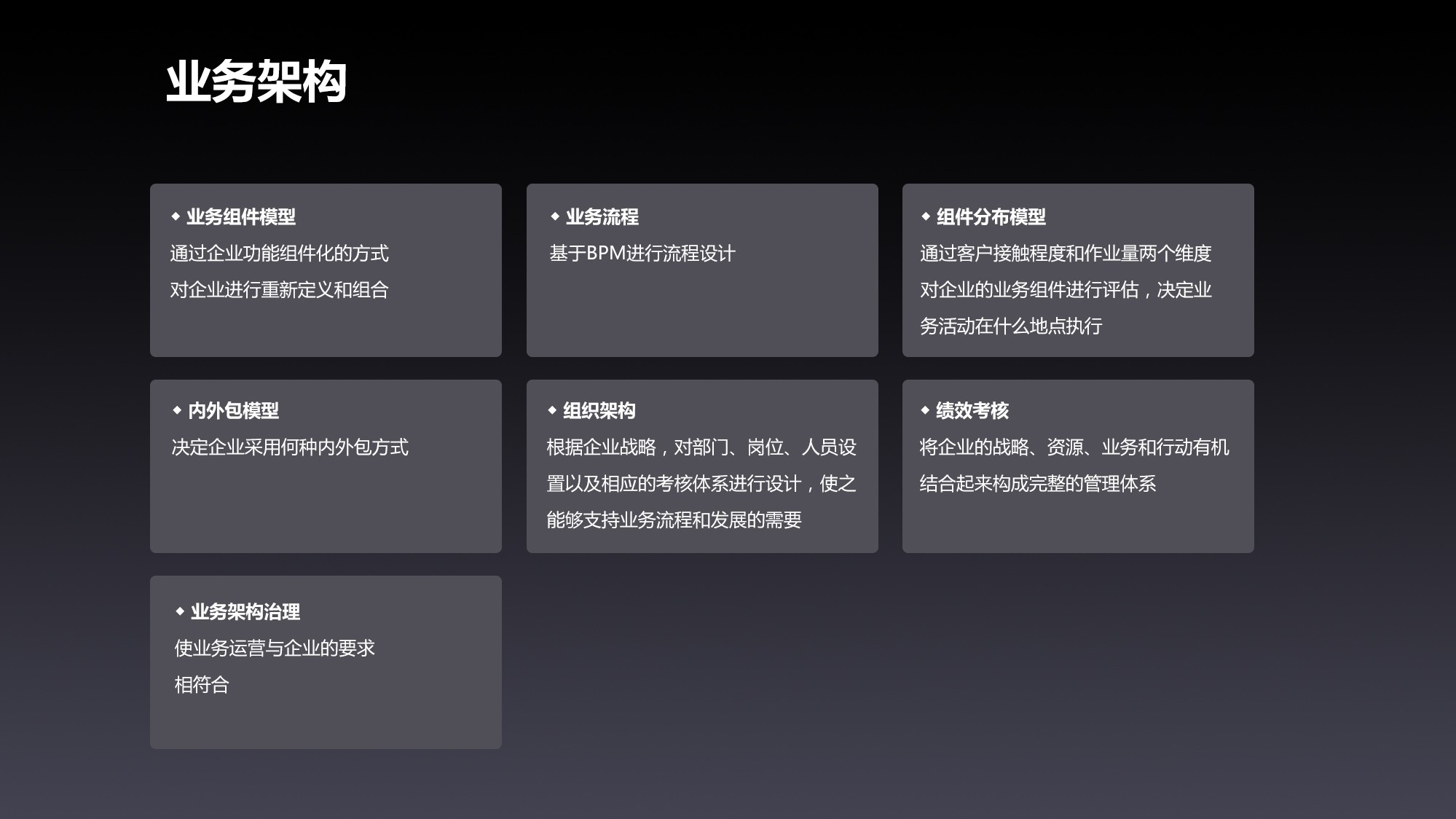 基于BPM設(shè)計(jì)業(yè)務(wù)流程,結(jié)合管理層ARC - ERP系統(tǒng)與“樞理”數(shù)據(jù)治理,梳理、優(yōu)化流程,消除冗余環(huán)節(jié),提升運(yùn)轉(zhuǎn)效率;借組件分布模型,從客戶接觸程度和作業(yè)量維度,評(píng)估業(yè)務(wù)組件,合理規(guī)劃業(yè)務(wù)活動(dòng)執(zhí)行地點(diǎn),降低運(yùn)營成本;以內(nèi)外包模型,科學(xué)決策業(yè)務(wù)外包方式,聚焦核心競爭力;依據(jù)戰(zhàn)略設(shè)計(jì)組織架構(gòu),適配部門、崗位、人員及考核體系,為業(yè)務(wù)流程筑牢組織支撐;通過績效考核,串聯(lián)戰(zhàn)略、資源、業(yè)務(wù)與行動(dòng),構(gòu)建完整管理體系;依托業(yè)務(wù)架構(gòu)治理,確保業(yè)務(wù)運(yùn)營貼合企業(yè)要求,讓戰(zhàn)略落地“看得見、摸得著”。